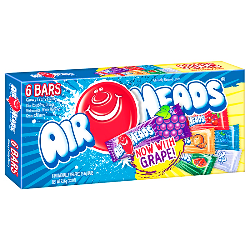 Airheads selection box! This box contains 6 individually wrapped regular size bars of Airheads laffy taffy candy. They're soft, and chewy and oh so fruity! Great as a fun gift for Airheads lovers or a sweet treat for yourself. Contains Grape, Watermelon, Blue Raspberry, Cherry, Orange and a White Mystery!