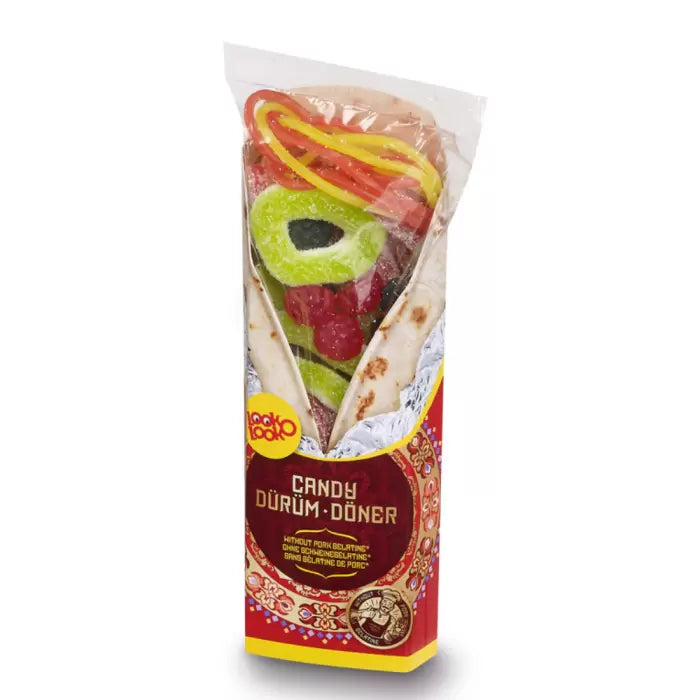 Fancy something sweet for lunch? This Look-O-Look Candy Durum Doner is packed full of fruit flavoured gummies and jelly sweets inside a lookalike wrap! It evens comes with packaging so it's doesn't all fall out!