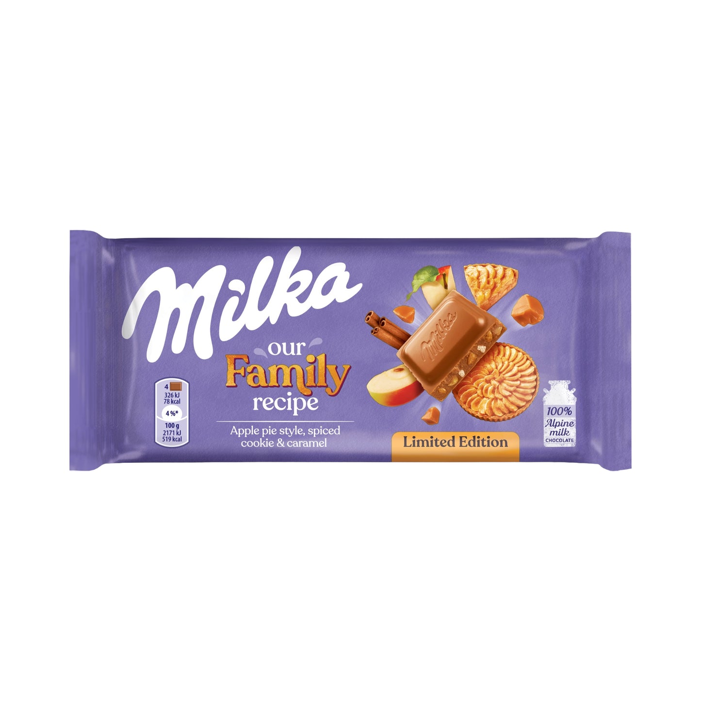 Limited Edition Apple Pie creation Milka chocolate with Apple Pie flavor, speculoos and caramel pieces.