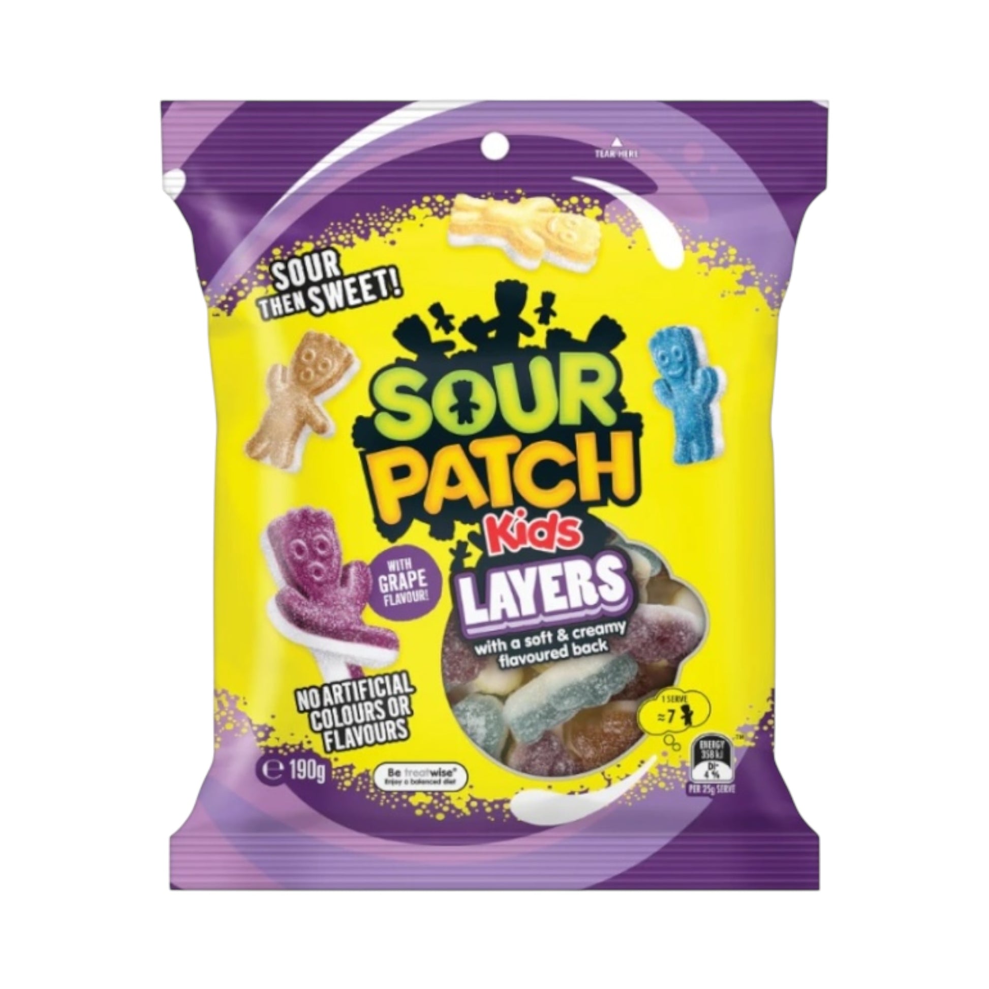 Get ready for a tangy and chewy twist with Sour Patch Kids Layers! Each soft gummy boasts two bold flavours in every bite - a punch of sour followed by a sweet and fruity combo. With a mouth-watering sour candy experience that's extra flavourful, these are a must-try for all candy lovers!
